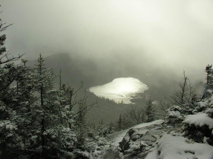 Finally able to get away for a couple of days we headed up to Franconia Notch just to get the hell out of Dodge. We hadn't been over 4000' in nearly a month and it was wearing us thin. I can't speak for Jude or Emma, but I know my attitude and outlook hits the skids when I don't climb something at least moderately high as often as I can. High Cannon Trail up to the summit of Cannon is short but has enough steepness and rock picking to make it a decent hike. Throw in wet leaves and a few inches of snow and it was difficult enough to satisfy my appetite for the mountains for at least a day or two. Arriving in Franconia Notch it was disappointing to see the cloud cover obscuring the summits, but thrilling to see snow on the mountainsides a little over 1000' up. There was a sort of drizzle in the parking lot as we got ready for the hike. Shortly into the ascent it became a freezing rain, then it began to come down heavy for a while. The sound of the sleet around us and on our hooded heads was loud and comforting. I was home! As we continued upward the sleet became snow as the rise in elevation coincided with a drop in temperature. Further below the warmer temps were beginning to melt the snowflakes resulting in the wet sleet, but up here the precipitation was allowed to dance in its most beautiful crystalized form which swirled around our faces and made its way to the ground and onto the branches lining the trail. As we went along it was apparent that it was beginning to gain a hold on the drab landscape, transforming it into that most beautiful state of appearance, a snowscape. The spruce were now blanketed in white splendor. The birch now stood out dark against the white background. The snow covered the wet leaves making footing treacherous. Snow stuck to the bottom of our boots making scrambling over rocks an adventure. The ladder on High Cannon Trail looked like something that led to a tree-fort I built when I was ten. Covered in snow it was a challenge to climb with two feet trying to kick enough snow off to make Jude's climb easier, one hand gripping the frozen rungs and the other hand trying to hold a squirming dog close to my body so I could get her high enough up to where she could make it up the ledge beside the ladder by herself. Lucky I have lots of practice at this kind of stuff and I survived this challenge to try other foolish "tempting of fate" type undertakings on another day. Eventually we made it to the junction with the Kinsman Ridge Trail, soaked from brushing against the surrounding trees despite my best efforts to knock the snow down before we passed. Although we had our rain-gear on, hiking on a day like this, the moisture finds a way to penetrate all layers. "Waterproof and breathable" is the biggest advertising scam in the world. I was soaked underneath from sweat and what wasn't soaked in sweat the snow had found its way to. We climbed up the tower and looked around at the 100 yard views then quickly made our way down out of the breeze and back into the forest to grab a quick bite and to change into dry shirts. We hiked down the KRT to the col between Cannon and Northeast Cannonball. At the junction with the Lonesome Lake Trail I looked up along the KRT and didn't really give going up a thought as we had been before and the weather wasn't cooperative enough to give the short hike another go. We were soon down at the shore of the as yet unfrozen Lonesome Lake. It was nice to now be hiking on a softer less rock strewn trail. As we descended from Lonesome Lake we passed once again back into autumn, leaving winter behind for the time being. It won't be long now!