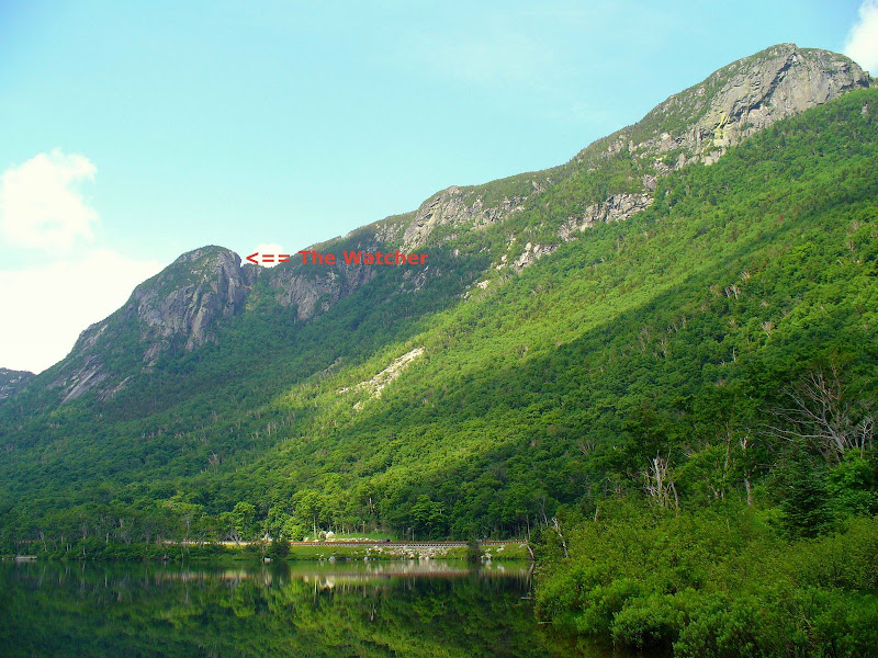 Although it's difficult to pick her out without the aid of binoculars, her small silhouette can be seen from the south end of Profile Lake by looking northward. The photo below simply gives you a general idea of where to look. You cannot actually see the profile of "The Watcher" in this particular photo.