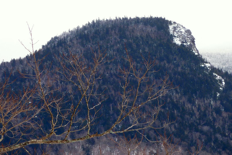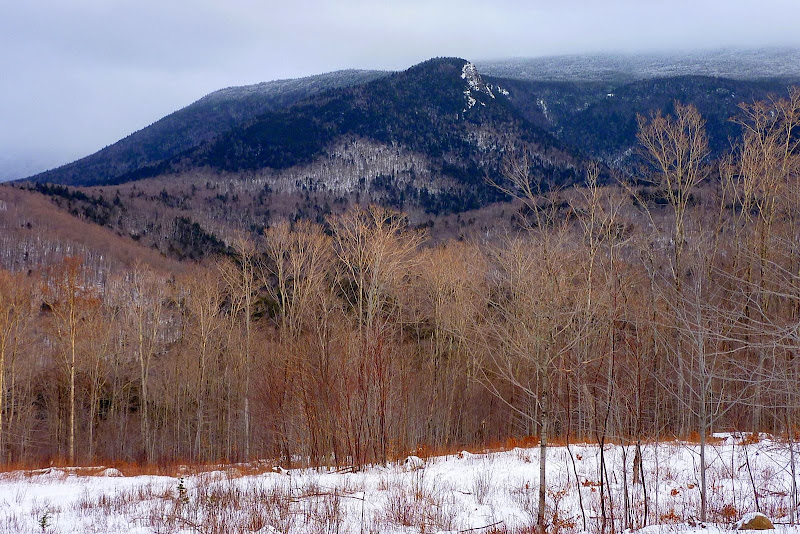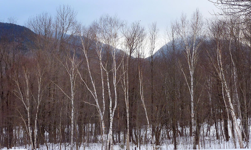 There are also many pleasant "peek-a-boo" vistas through the leafless trees, such as shown in the snapshot below of the Carter Notch peeking through the birches.