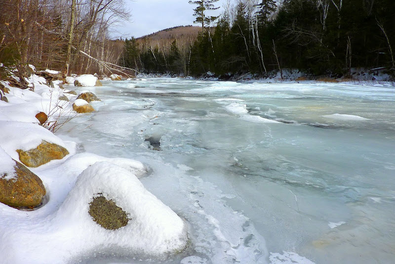 There are long stretches of trail that takes you along the banks of the Peabody River. Below is a snapshot showing the river that has been frozen by Old Man Winter.