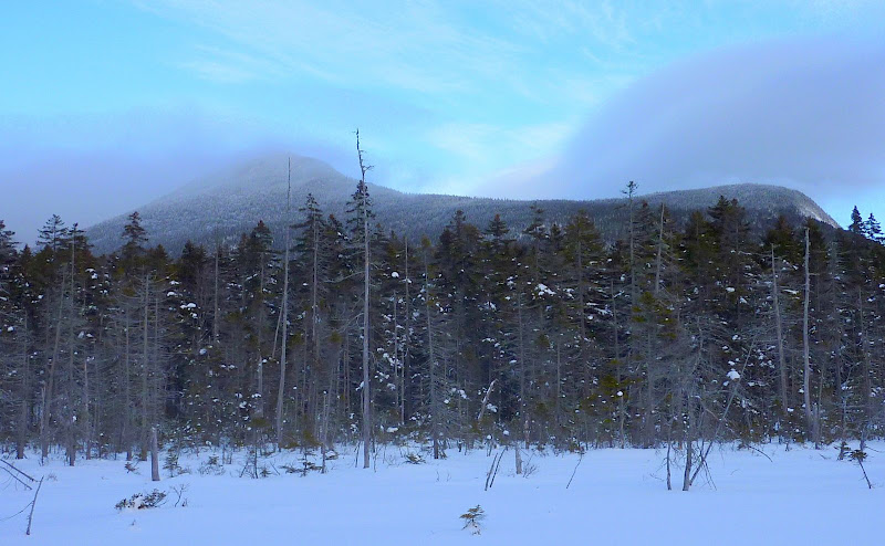 From the standpoint of photographs, the highlight of the day were the views from an open bog which we accessed via a short 10 minute bushwhack off the west side of the Cedar Brook Trail (from a point about midway between the Hancock Notch Trail and the Hancock Loop Trail). The photo below shows the top of South Hancock peaking through a misty cloud.