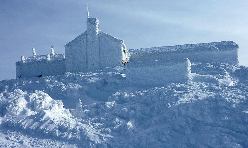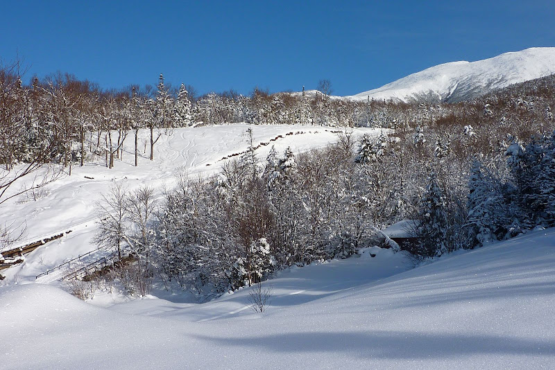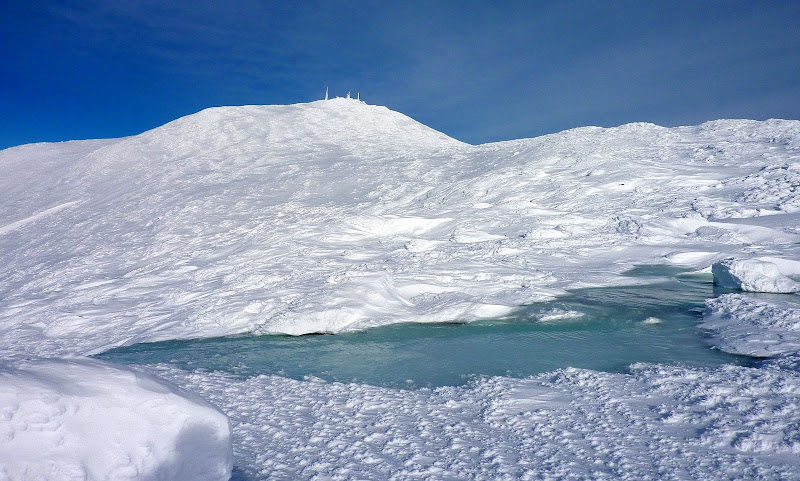 Perhaps it's not unusual, but I found it amazing that there was open water at that elevation at this time of year, and that it was actually flowing!! The aquamarine color of the water against a stark-white landscape of Mt. Washington was quite a contrast to see.