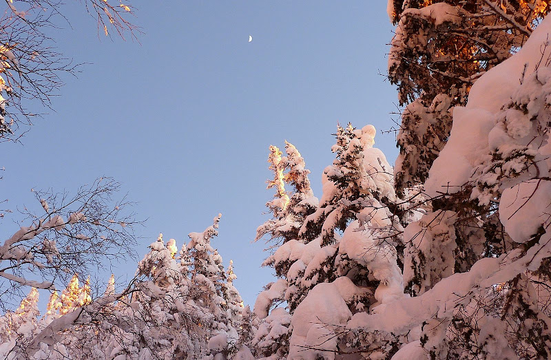 It was also quite impressive to look overhead at the alpenglow on the treetops against a blue sky, and punctuated by a picturesque half moon.