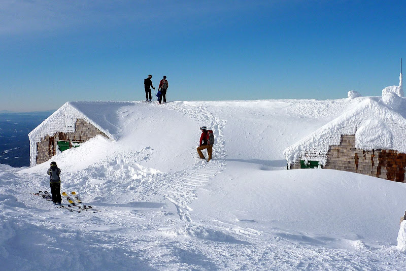 Although it was a brilliant sunny day, and only a hint of a breeze, we were the only hikers up there! We would not have seen another person all day had it not been for a chance meeting with some backcountry skiers who dropped by the hut along their way down the mountainside. They swooped by just shortly after we arrived, and they immediately went up on the roof of the hut to have their lunch.