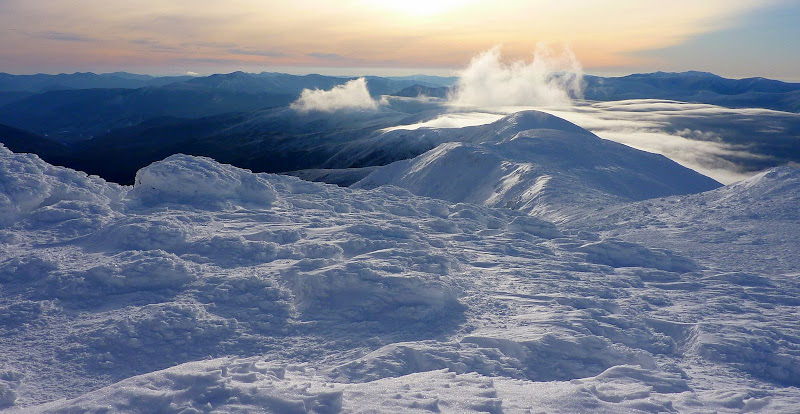 Within 20 minutes or so, we arrived at a wind-free Mt. Monroe where the air temperature on my pack thermometer read a balmy 30 degrees. Of course, there were the stunning 360 degree views. And on this particular day, the southwesterly view was made especially interesting by a slight undercast. The full beauty of this view was difficult to adequately capture since it required shooting directly into the sun which was low on the horizon.