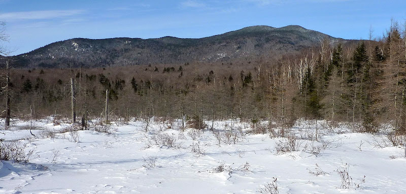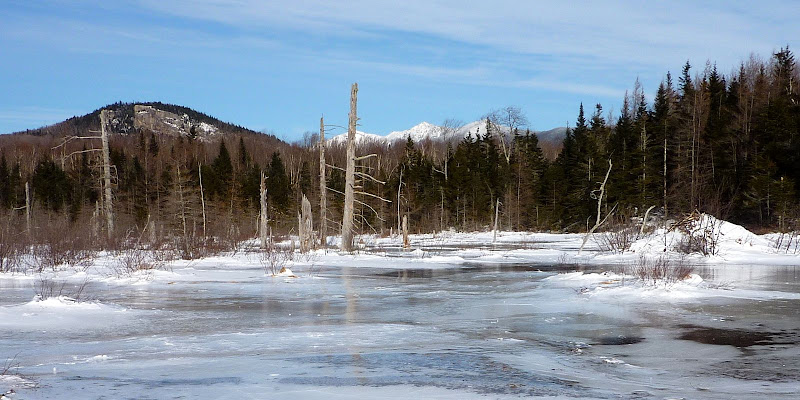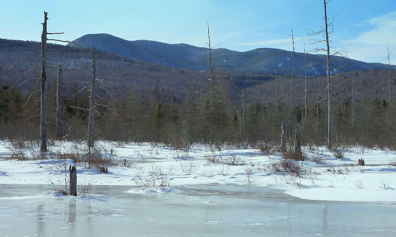 The views from Bog Eddy were the highlight of the day. A few of the snapshots taken from that location are shown below. In the first photo, there are the "lumps" of Mt. Pemigewasset and the Franconia Range in the background,. And in the foreground, on the right side of the picture, is yet another snow-covered "lump" which is a beaver lodge near the edge of the bog.
