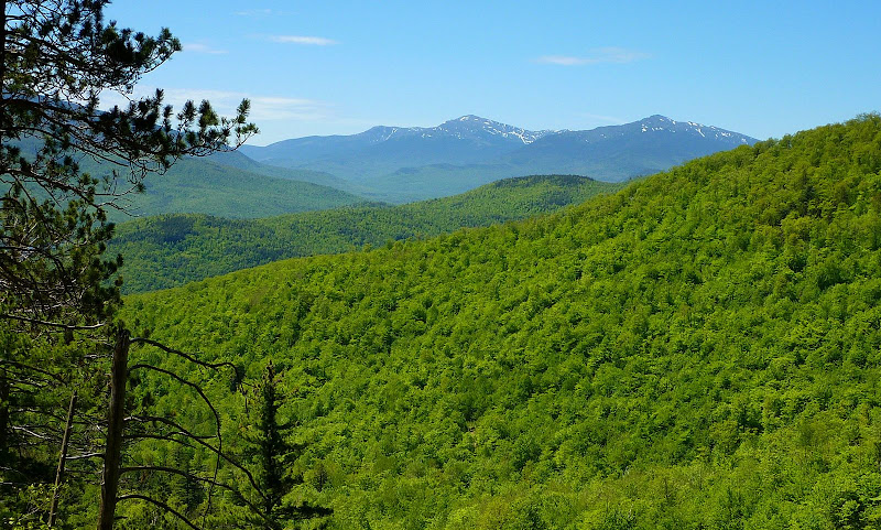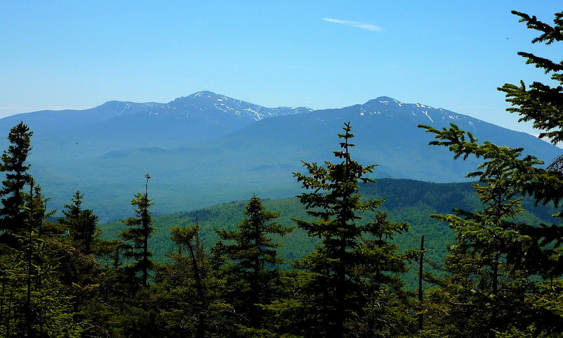 Okay, to get back to my hike, I finally arrived at Wocket Ledge (a rather odd-sounding name that could've been coined by Elmer Fudd). There might have been a good view from here at one time, but now it's a bit overgrown and so the view is somewhat restricted by trees. Below is a slightly zoomed snapshot of the Presidentials taken from this ledge.