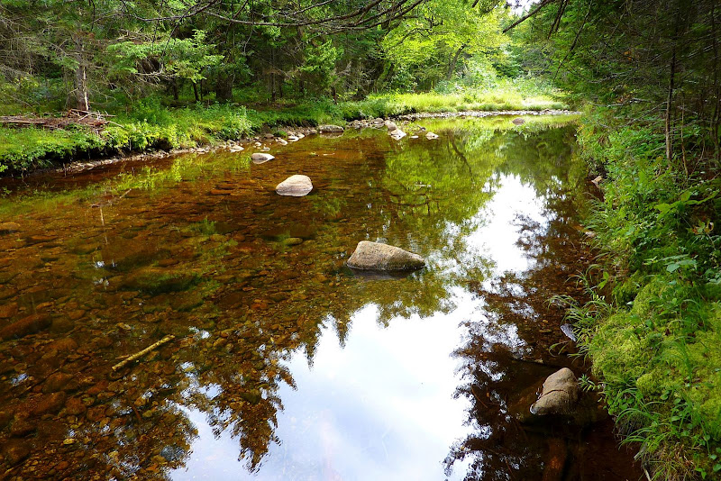 The East Branch was gently flowing in many spots, but at other spots, it was still and "reflective".