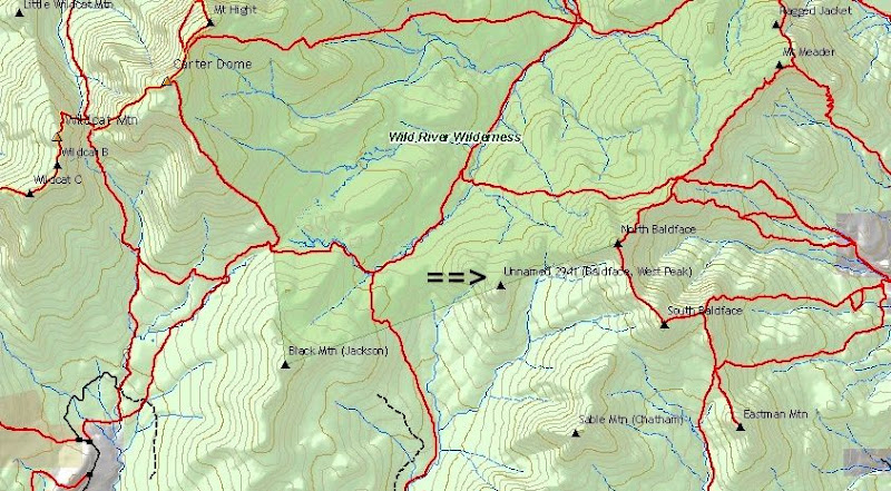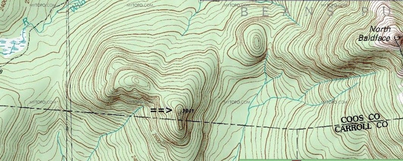 Looking at a topographic map, there is a 2,941 ft peak that is situated nearly due east of the Wildcat Ridge and nearly due west of North Baldface. It is unnamed on topographic maps, but some peak-baggers refer to this mountain as "West Peak, North Baldface". However, I think of it as simply West Baldface.