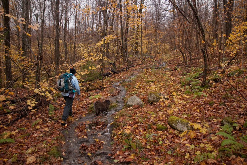 We drove over from Gorham in a soaking rain which let up somewhat at the trailhead as we set out. We set out through wet leaves on trails that better resembled brooks. Before we were above the deciduous forest we met a young couple on their way down who warned of snow up above. They might have been a little surprised as a smile broke a mile wide across my face. I hadn't thought about there being any snow at these elevations. With the summits invisible behind heavy clouds we had no way of knowing beforehand.