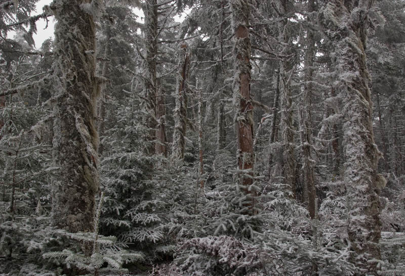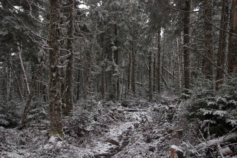 We found the first traces of snow at about 2500' and by the time we entered the conifers at 2900' there was a good inch coating everything. We had gone from wet leaves and flowing water to standing water and mud to snow and mud as we rose a thousand feet in elevation. On the highpoint of Starr King I stopped to bundle up now that the bulk of the climb was done. I thought I heard a snort in the woods, but I put it off to imagination until on the return from Waumbek we could see from fresh tracks that a moose had followed us, though we never saw him.