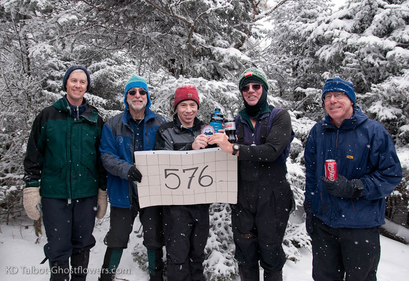 Jeremy became the thirteenth individual in the New Hampshire hiking community to complete this task and have his name forever inscribed in the great book of incredible mountain feats. To add to the individual uniqueness of this event, four other finishers of the list joined him on this hike and gathered on the summit to officially award him the patch and honors which come with the completion of this goal. The fact that there were five individuals who have completed this task on the same summit at the same time to celebrate may also have been a unique occurrence, I'm not sure, but it should certainly be noted as at least a rare occurrence. ( Correction: There were 5 at MEB's finish as well. )