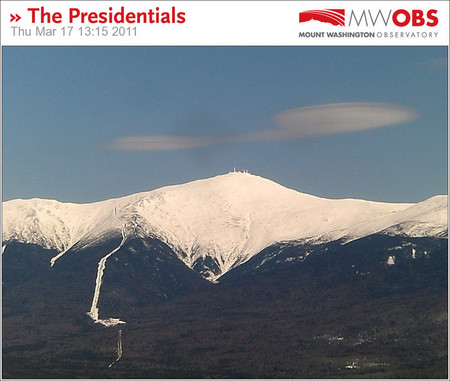 I drove on route 302 from Maine into N Conway and saw 3 of these clouds stacked one above the other just to the east of Mt Washington. All 3 were close to the same size. Looked like a stack of pancakes. Then off to the east of Wildcat there were 3 more stacked the same way. I tried to find a clear spot to stop and and take pictures, but was not successful. I did get this shot from River Road in N Conway both as a single photo and also 8 individual photos (15.2 megapixels each) stitched together.