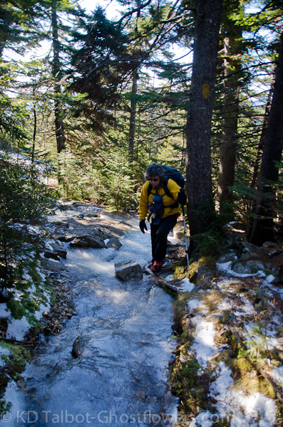 Short and simple with great views pretty much describes Kearsarge North. This makes it a favorite to return to, plus I wanted to check out the work done on the fire-tower this autumn. We had a remarkably clear, windless day to go and visit our old friend. There was some crunchy snow right from the get go, but good traction and dry conditions on the lower half of the trail. As we approached the lower ledges more and more ice appeared along the trail. After skirting around it for awhile we stopped and put on the microspikes. If there were some sort of gear between micros and full crampons they would have been useful on what basically became a frozen brook trail.