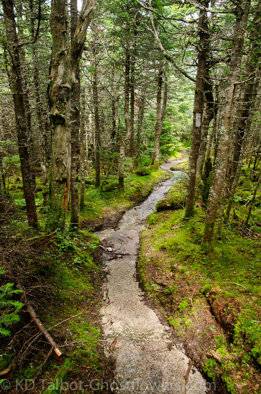 From this southern ledge we watched the predicted rain storm engulf the high peaks as it spread across Pinkham Notch and unleashed its drenching rain. This can make hiking in the Presidential Range treacherous even without lightning as it makes the lichen coated rocks slippery as ice. I have taken many a tumble on such rocks, they are unforgiving. The mica schist make up of these has an extremely rough surface which can tear skin and leave unprotected limbs as well as paws torn and bloody. Pondering this as we stood on the ledges and watched the rain pass I thought of how lucky we were to have been able to hike these mountains with Emma, her light weight saving her pads from injury on these bony trails.