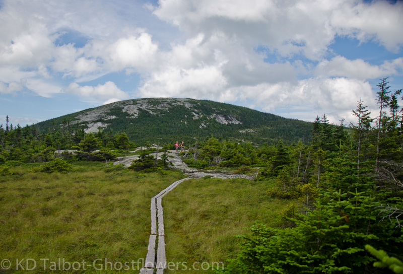 We were now standing at the beginning of the fun section of trail between West and East Baldpate. Somewhat refueled I managed to hike down the trail and over a couple of sets of ladders to where there are puncheons laid across an alpine bog in the saddle between the summits. There were patches of Mountain Sandwort just coming into bloom all along the trail through this section. We were soon headed up along the ledges on the southern flank of East Baldpate, amazingly reminiscent of the ledges above Baldface Shelter on South Baldface.