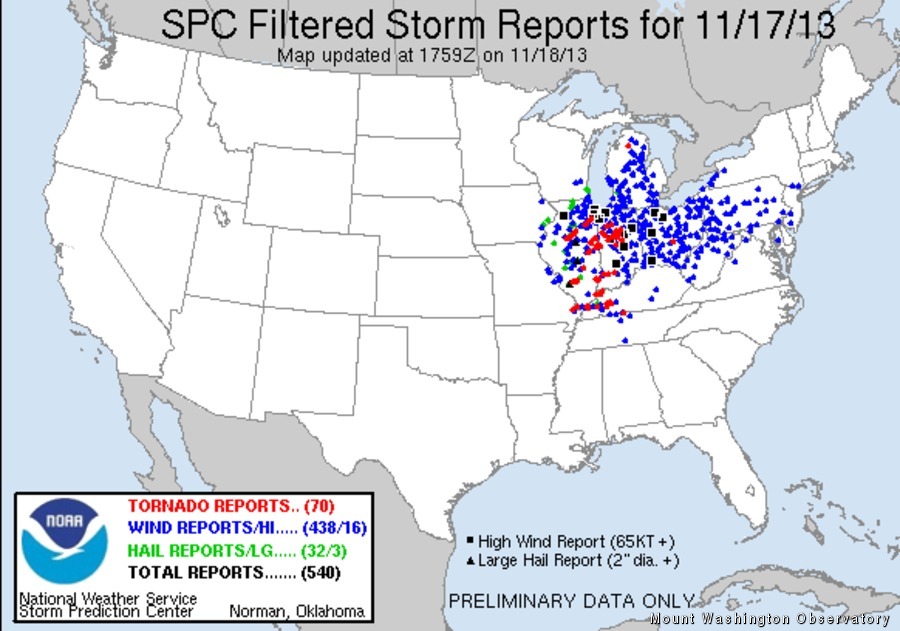 Yesterday’s severe weather outbreak across the Midwest/Ohio River Valley will go down as one of worst in recorded history for the month of November. Preliminary reports from the National Weather Service indicate that more than 70 tornadoes touched down across six states, the majority of which occurred in Illinois and Indiana. The most prominent tornado was a violent EF-4 (winds 166-200 mph) that passed through the town of Washington in Tazewell County, IL. Records show that this is the first EF-4 to strike Tazewell County since at least 1950.
