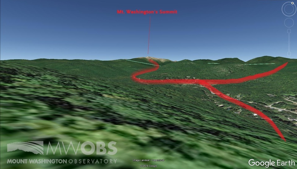 However, 83 years ago, atop this very mountain, a storm for the ages was taking shape. An intense area of low pressure was traveling up the coast of New England, while a formidable high pressure center was building in from Canada. This is an all-too common list of ingredients for high winds on the summit of Mount Washington, but an additional element proved to be a deciding factor between just another Mount Washington high wind day, and what would become a world-record wind on the surface of the Earth. That element was the direction of the wind—the track of the impending low pressure system was such that it sent winds rushing towards Mount Washington’s summit from a southeast direction. While the notorious “funneling effect” of wind from our most common wind direction (west) acts to accelerate winds as they pass over our summit, this effect is amplified further from the southeast due to the terrain off that direction. The corridor of Pinkham Notch acts as an effective and much more drastic “ramp” up to the southeastern flank of the Presidential Range, with Mount Washington as a proverbial target directly in its center.