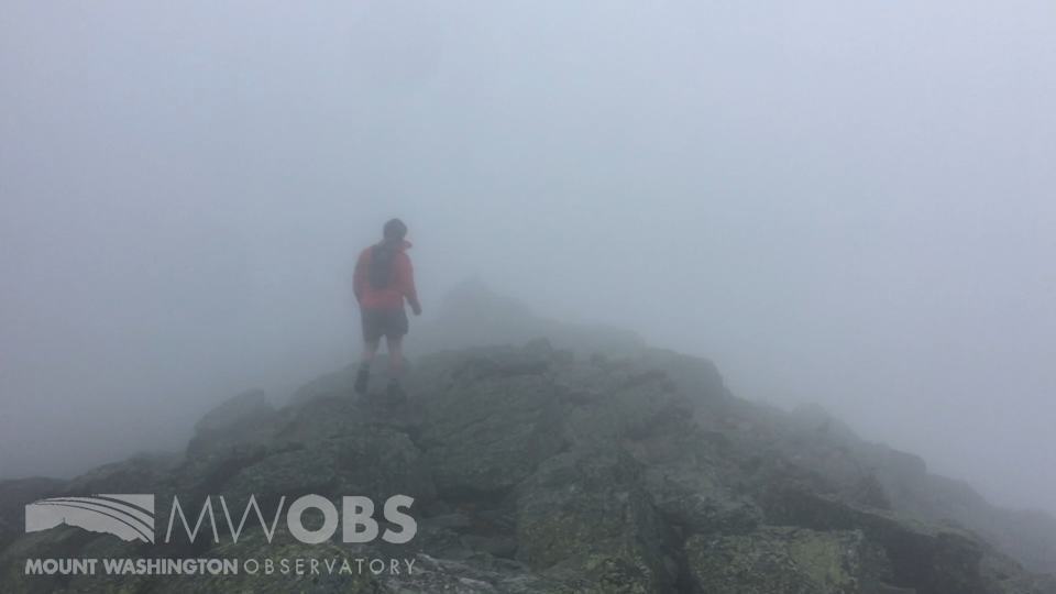 Occasionally the weather up here doesn’t permit these evening hikes, but we didn’t let yesterday’s thick cloud cover stop us. Our hike started by leaving the Observatory tower and following the edge of the Sherman Adam’s building until we found the head of the Nelson Crag trail. As we headed down the trail, over both the Cog Railway and the Auto Road, visibility got even worse.