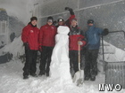For one, the entrances into the building are sheltered from NW winds whereas with E winds, they are completely exposed. This makes opening and shutting them quite difficult when it is gusting over 100 mph and greatly affects the pressure in the building and in turn one’s ears. Another issue with the doors is their air-tightness. Snow being blown at over 100 mph can find its way into the very wee-est of cracks and this includes door jams. Because of this, we had to shovel snow out of the tower every hour or two just so we could get the door open. In addition to snow coming in the doors, it also piles up outside the doors. This morning the crew spent several hours shoveling 7 foot high drifts from the entrances and fire exits. Perhaps the most memorable difference of east winds is the challenges presented when deicing the instruments. This is a crucial part of our job and is really one of the biggest things that validates our presence on the mountain. With temperatures as they were and the moisture in the air (average snow density was around 20-25%), glaze ice accrued on all the instruments. As you may know, glaze is not our friend most of the time and is quite difficult to remove. Climbing into the parapet to deice with winds gusting into the 120’s is difficult in any scenario. With NW winds however, one can crawl against the wind, position their legs against a pair of posts, and lean back into the wind, while swinging a crowbar to remove the ice. With East winds, the wind hits you as you climb up the ladder so there is no easing into it. Once above the ladder, there is nothing to post your legs against and you can’t lean back because there is no protection behind you. The only option is to stand up quickly and get doubled over the metal ring, try to regain some control, and hit away at the ice. This took absolute teamwork last night. Heading out to deice, I realized the pitot skirt was accumulating far too much ice and it needed to be removed for fear of it blocking the all important static pressure holes. I fetched Ryan to give me a hand, but even with the two of us, we couldn’t safely do it. We then fetched our third musketeer, Brian, who after pondering for a moment, decided the only way to do was just to do it. He climbed up as Ryan and I hung on to his boots to anchor him to the ground, while our faithful intern Nick ran the video. With a few masterful whacks, the ice was removed and we carefully positioned Brian’s feet on the ladder for the quick descent. There was then much rejoicing and adrenaline. Quite the night atop this mountain!