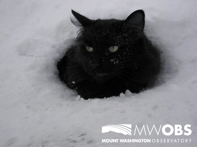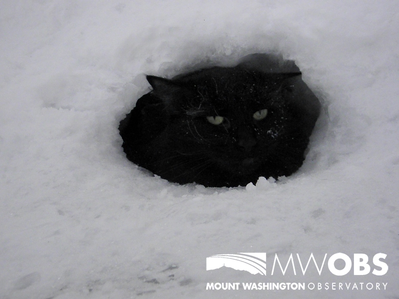 However, it was a little on the warmer side yesterday, and the winds were light, so this feline decided to take a look around on the observation deck. I found a purrrfect little spot on the deck, nestled underneath a snow and ice bank. That’s right–it was my very own snow cave, which was just big enough for me to stretch out my idle paws, but cozy enough to keep me warm and purring!