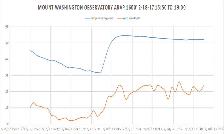 Temperature (blue) and wind speed (orange) at the ARVP 1600’ station at the base between 3:30 and 8:00pm on February 18th. A sharp temperature rise of nearly 22 degrees, and an increase in wind speed was observed around 5:30 in the evening.