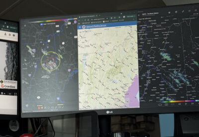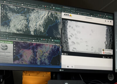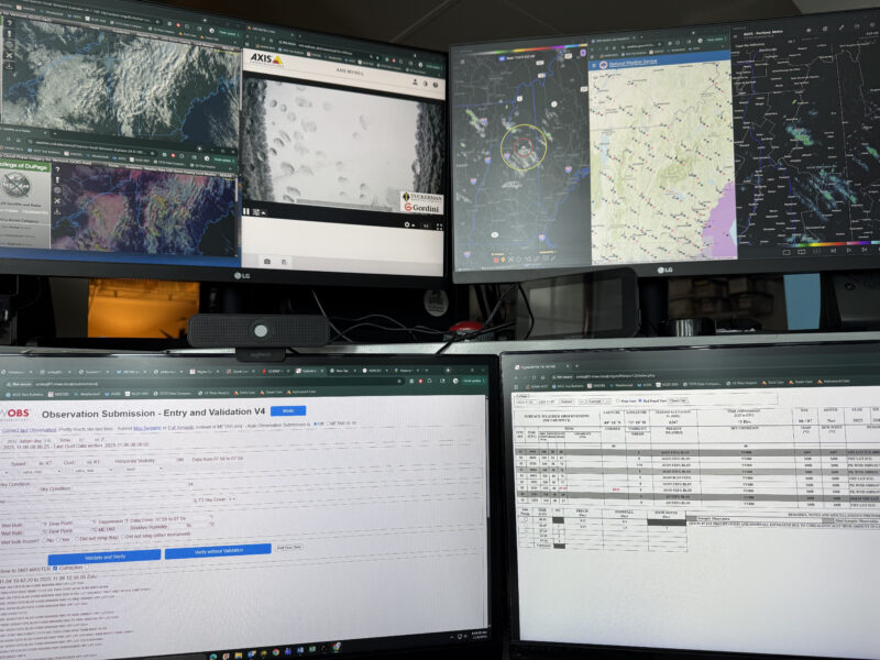 The top right monitor, pictured left, is usually tracking two flavors of radar and the current conditions measured by stations around the area. Radar is an extremely useful tool for monitoring precipitation in our local and regional area. The radar to the left is a regional mosaic that incorporates radar retrievals at different locations and different levels, compiling them into a composite image. The bullseyes on the screen are helpful for indicating how distant showers, precipitation, or lightning are from the summit, with the red circle signifying a range of 10 miles and the yellow circle signifying a range of 25 miles.