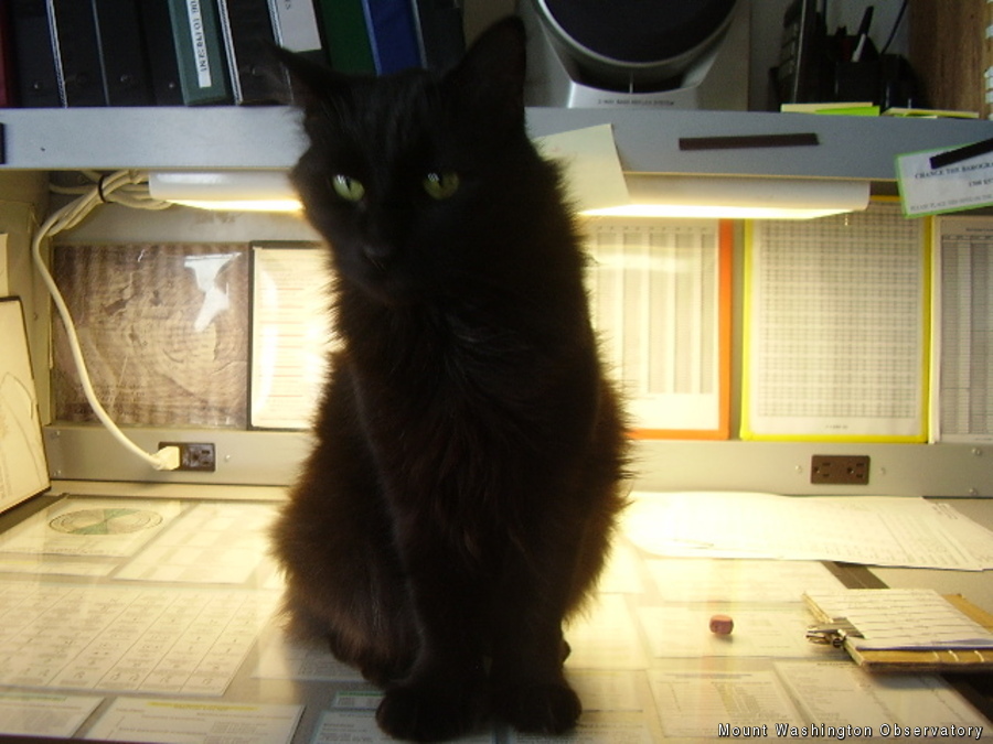 Yes, finally I have the purrr-fect opportunity to get in a few words before the holidays are in full swing. Everyone here on the summit has been busy hard at work, but I, Marty, always manage to push my way in to grab attention from the crew up here. No better way to let them know I wanted to paw in a comment by running across the keyboard as Erica and Mike typed away at their work yesterday. This past weekend the crew started hanging lovely Christmas wreaths that were graciously donated to us, not only do they look wonderful, but they accent the weather room purr-fectly.