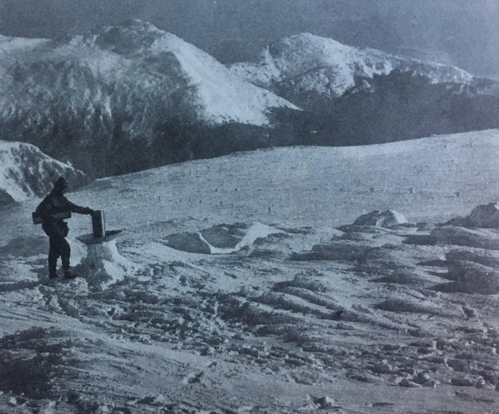 “His first duty is a half-mile visit over jagged, icy rocks to the three rain and snow gauges on the north, west, and south sides of the summit. These are invariably frozen and must be melted before the first of the seven daily readings can be made.”