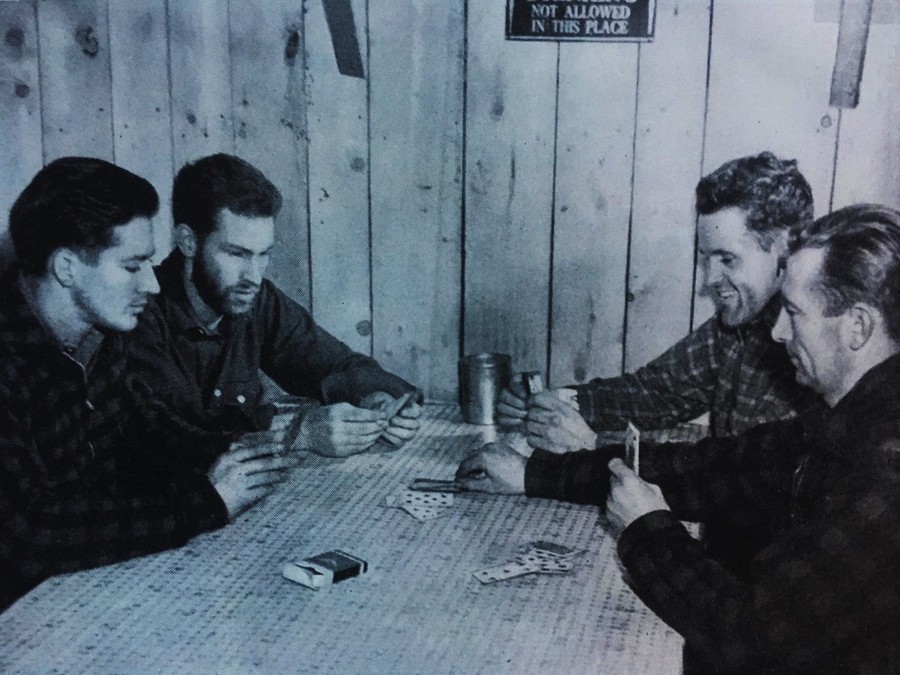 “In their offtime, Brown, Blackwood, and Elsner hunt rabbits below the tree line, fish through the ice in the Peabody River, and ski. They have contrived a game they call Sockey and play it for hours nightly. A homemade table-tennis set offers a change from Sockey, and a dozen packs of cards are worn out by the end of a season. The three have formed an antiswearing pact, with a nickel fine for every cuss. The treasury now holds more than five dollars, and the hermits blame it all on the Japanese attack on Pearl Harbor.”