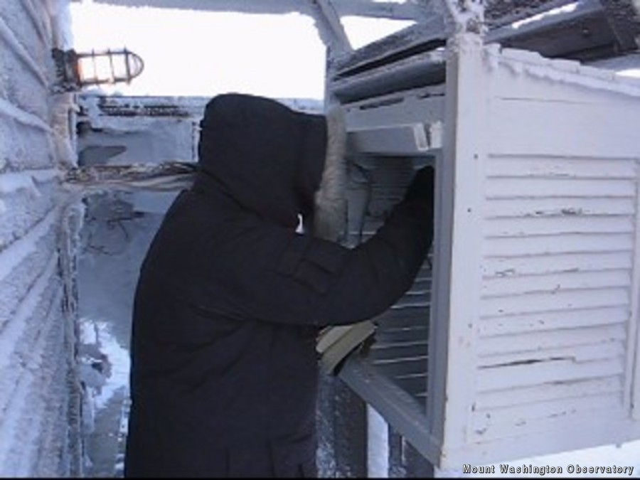 When the sun shines, regardless of how cold it is, it is always nice to go out on the deck, here, Neil Lareau, is slinging a psycrometer to determine temperature and a wet bulb temperature to determine the dew point. The summit of Mount Washington can be seen in the back. We found the temperature to be -7F (-22C), Windchill -44F, with several layers of clouds overhead.