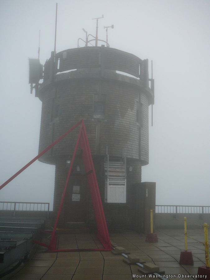 While I will not say this very often, I think today has been a good day not to be out on the trails. Other than watching the large cap cloud pour over us into the Great Gulf early this morning (as Mike mentioned below), it has been pretty crummy hiking weather all day. The Summit has been in the clouds with minimal visibility, frequent rain showers, and temperatures hovering around the mid-30s. Walking around the Sherman Adams building and working down in the Observatory gift shop, I have not come across too many hikers with smiles on their faces. In fact, for the first time since I’ve been working in the gift shop, I think we sold more winter gloves, socks, and rain gear than Marty memorabilia! Something tells me hot chocolate sales were at a record high upstairs as well. For those hikers who are braving the weather out there (tomorrow’s forecast looks pretty similar to today’s), make sure you have proper footwear for wet rocks and bring enough clothing for potential hypothermic conditions.