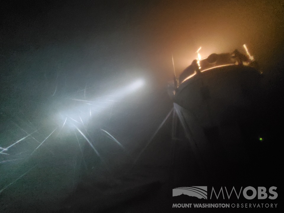 My coworkers and I are currently in the middle of a 10-day long shift up on the Rock Pile, and it is shaping up to an exciting time. As I write this, Jay, Nate and I are finally about to experience our first snow event of the season. The summit has had a few snow events already, but so far, nearly all of the snow accumulation has happened while the three of us were off the summit, followed by a melt-out during our shift up. Finally, it seems to be our turn for snow! Currently, (11/22/20 at 10 PM EST) the summit is in the clouds with temperatures around 21°F, with winds out of the south at 49 mph. A low-pressure system is bringing a warm front through the region tonight along with plenty of moisture out of the south, which is currently responsible for the sparse snow showers passing through. Below is a spectacularly blurry photo of the snow coming in, illuminated by flashlight beam with our instrumentation tower in the background.