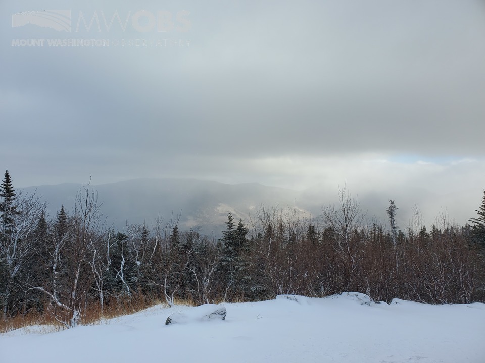 A few questions arose when it came to the forecast for tonight into tomorrow. How much snow will we receive? Will the warm front bring summit temperatures above freezing? Will winds gust over 100 mph tomorrow evening? Snowfall and high winds are always exciting, and these things can be difficult to forecast, especially when winter has not fully arrived yet. Only time will tell. So far this month it feels like we’ve jumped back and forth from one season to the next. The weather conditions this shift have been drastically different from our previous week on the summit. Two weeks ago, on Sunday, November 8, we broke the daily high temperature record, reaching up to 50°F in the afternoon. It was the first of five days in a row where our record daily high temperature was either broken or equaled. 50 degrees may seem chilly, but for us, it was like we time-travelled back to summer! To give you an idea of how warm that is for this time of year, the all-time November temperature record at Mount Washington is 52°F. If it were an average November day, we might have reached somewhere in the lower to mid-20s. It may not have been shorts-and-a-t-shirt kind of weather, but it was as close as we were going to get in early November. We had relatively light winds, sunny skies, and spectacular views from the summit for days in a row. Even on the non-record-breaking days, we enjoyed well-above-average temperatures throughout the entire shift. The snow and ice that had built up during the previous week had all but melted out, with just a few deep patches lingering. I really enjoyed finishing off my night shifts with a sunrise each morning. Below is one such sunrise – the photo was taken from inside the rotunda.