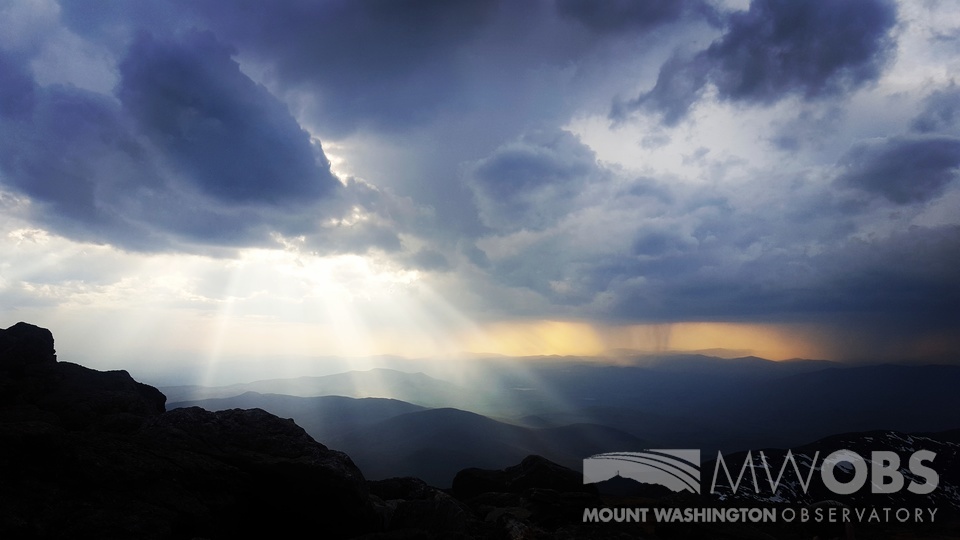 As the temperatures rose on Thursday, the atmosphere became increasingly unstable and lines of severe thunderstorms developed and barreled into the White Mountains. Typically when thunderstorms roll through, the summit is in the clouds and the view is occasional flashes that turn the gray fog a shade lighter. For the storms Thursday we were in the clear and able to see countless bolts of lightning stream across the sky that lit the Presidential Range up as if it were daytime. During those storms, the temperature dropped 10 degrees as colder air aloft was pulled down to summit level, winds ramped up to 80 mph, and ¼” hail fell.