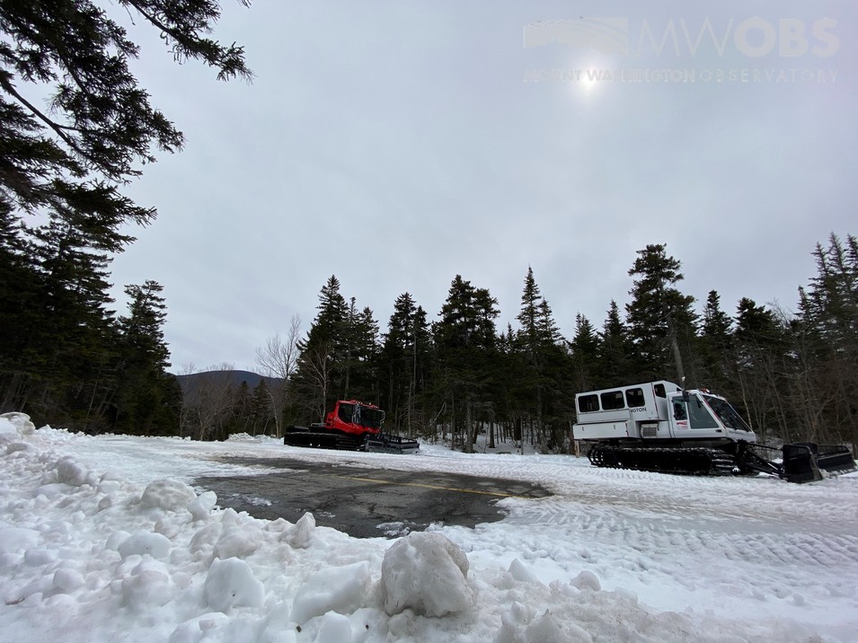 The dynamic nature of the weather on Mount Washington, with its quick and unexpected changes of conditions, make the task of planning and executing transportation difficult. With the Mt. Washington Auto Road now being closed for the season, our snowcat has been transported by flatbed up to Winter Cut-Off (about halfway up the road) where it will be staged until the road is snow covered top to bottom. The staging of the snowcat prevents the lower, bare sections of road from being damaged by the metal cleats and carbide studs on the tracks. Before snow limits our mode of transportation to the snow cat, we also utilize our 4wd van and pickup truck equipped with tire chains. All of us observers (and interns) are trained on installing the tire chains to make for a quick installation in inclement weather if need be. Sometimes, weather conditions will require the use of all the different modes of transportation in one trip: van without chains to almost tree line, then van with chains up to the snowcat, followed by the snowcat the remainder of the way. Thanks to a super generous donation, we also received a new pickup truck the beginning of this year, which is equipped with a V-plow. The relatively new design of the V-plow is much safer for us doing snow removal, as it forces the snow to both sides of the truck and cuts through the snow, as opposed to a traditional straight blade plow. A straight blade requires the plow to be angled to push the snow out of the way, which can dangerously force the truck sideways on the narrow summit road.